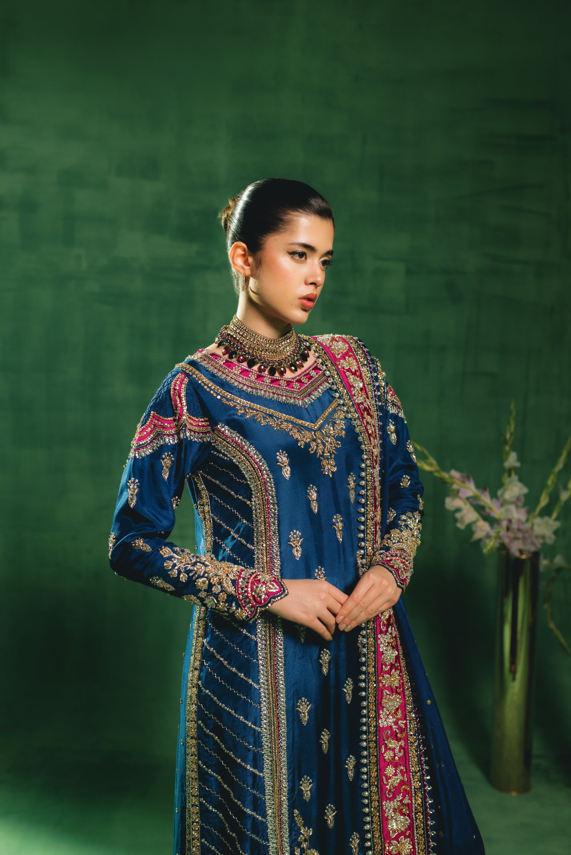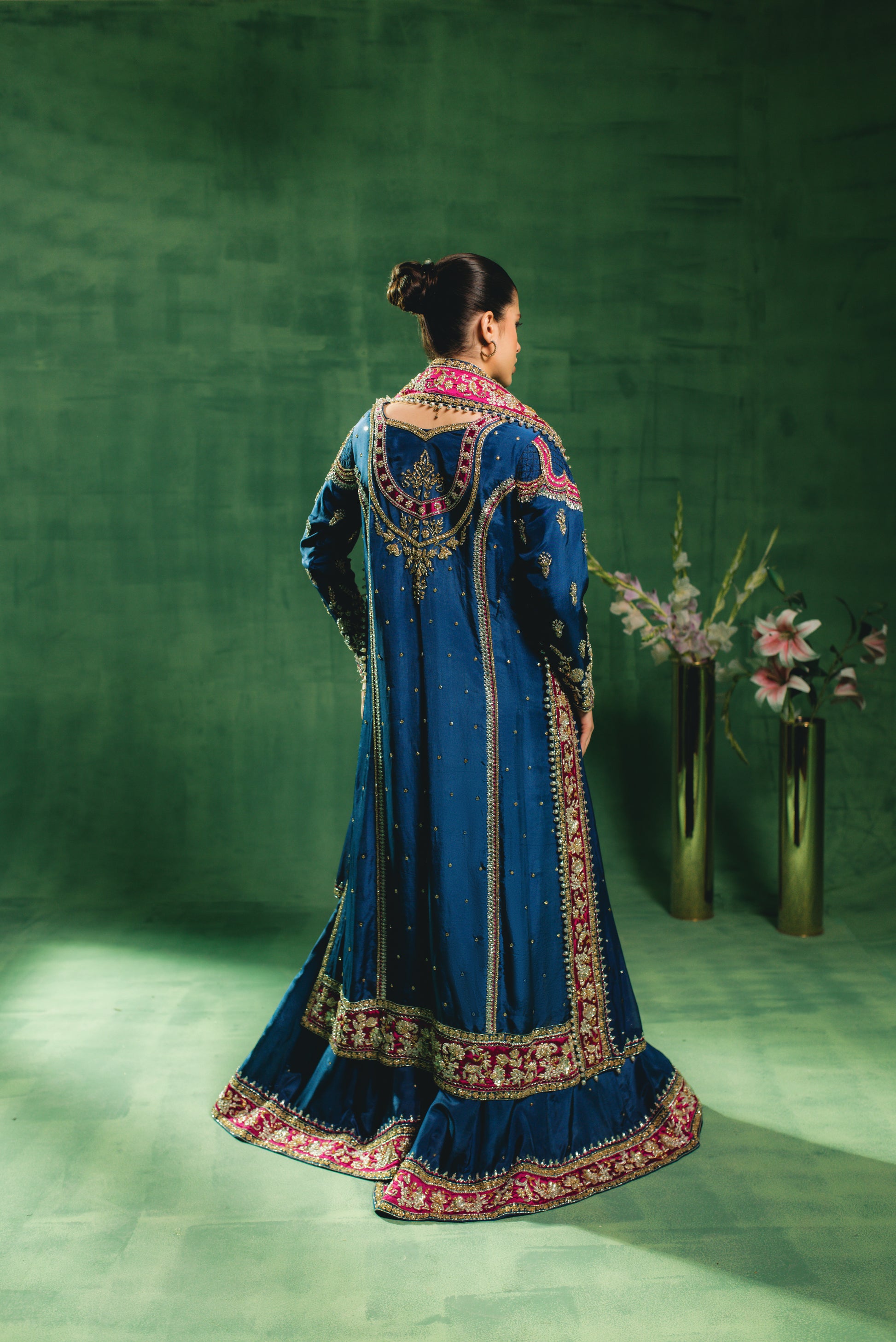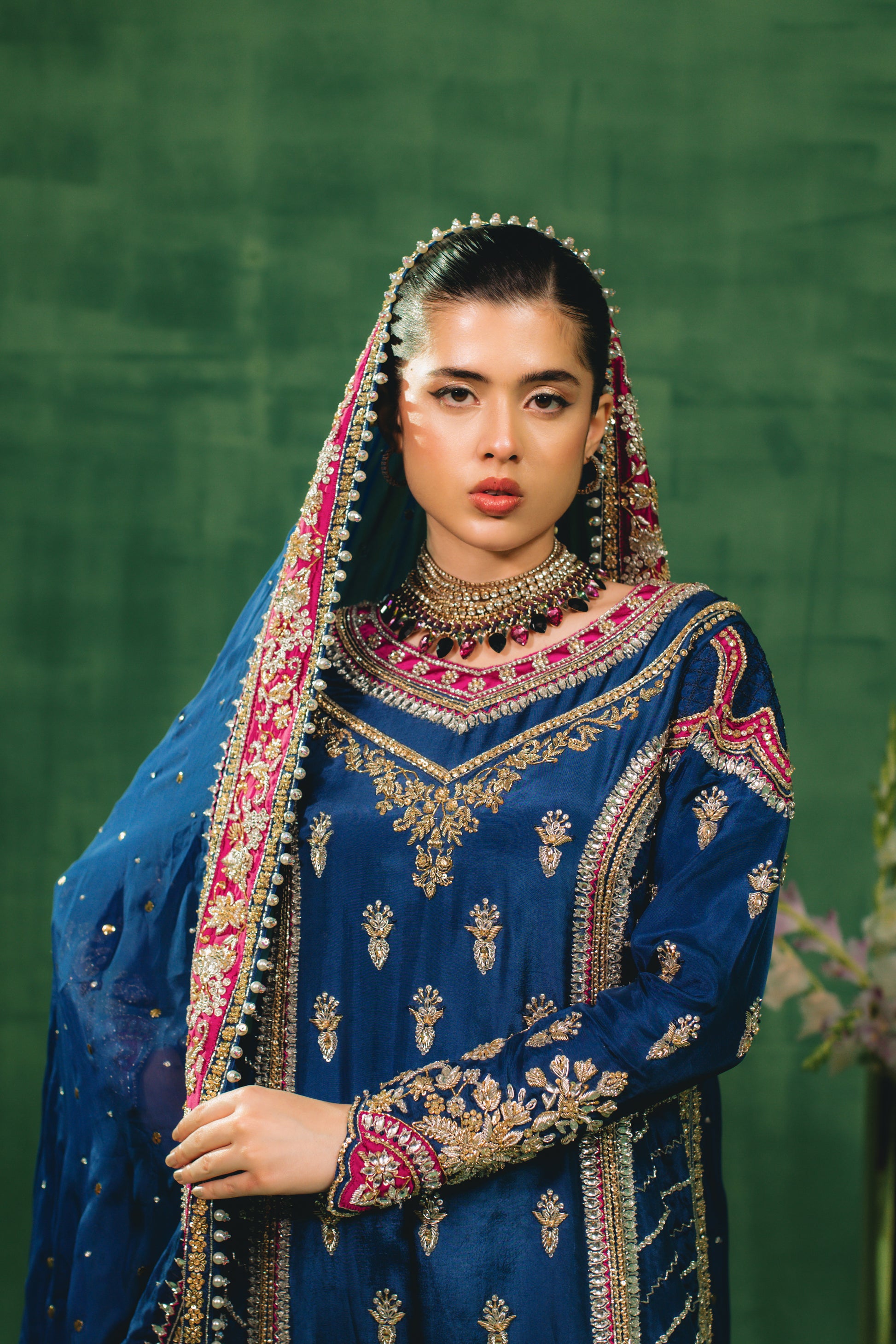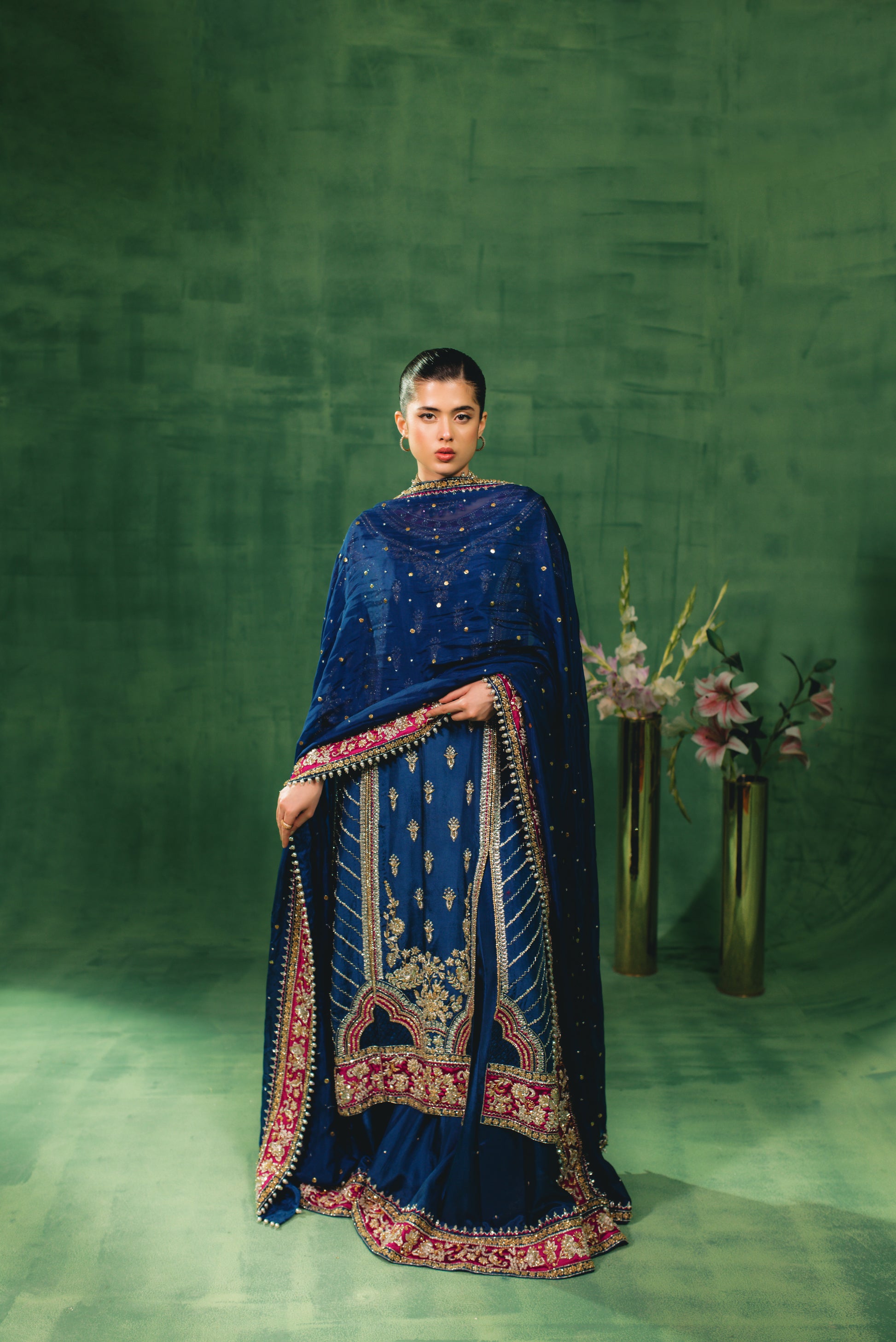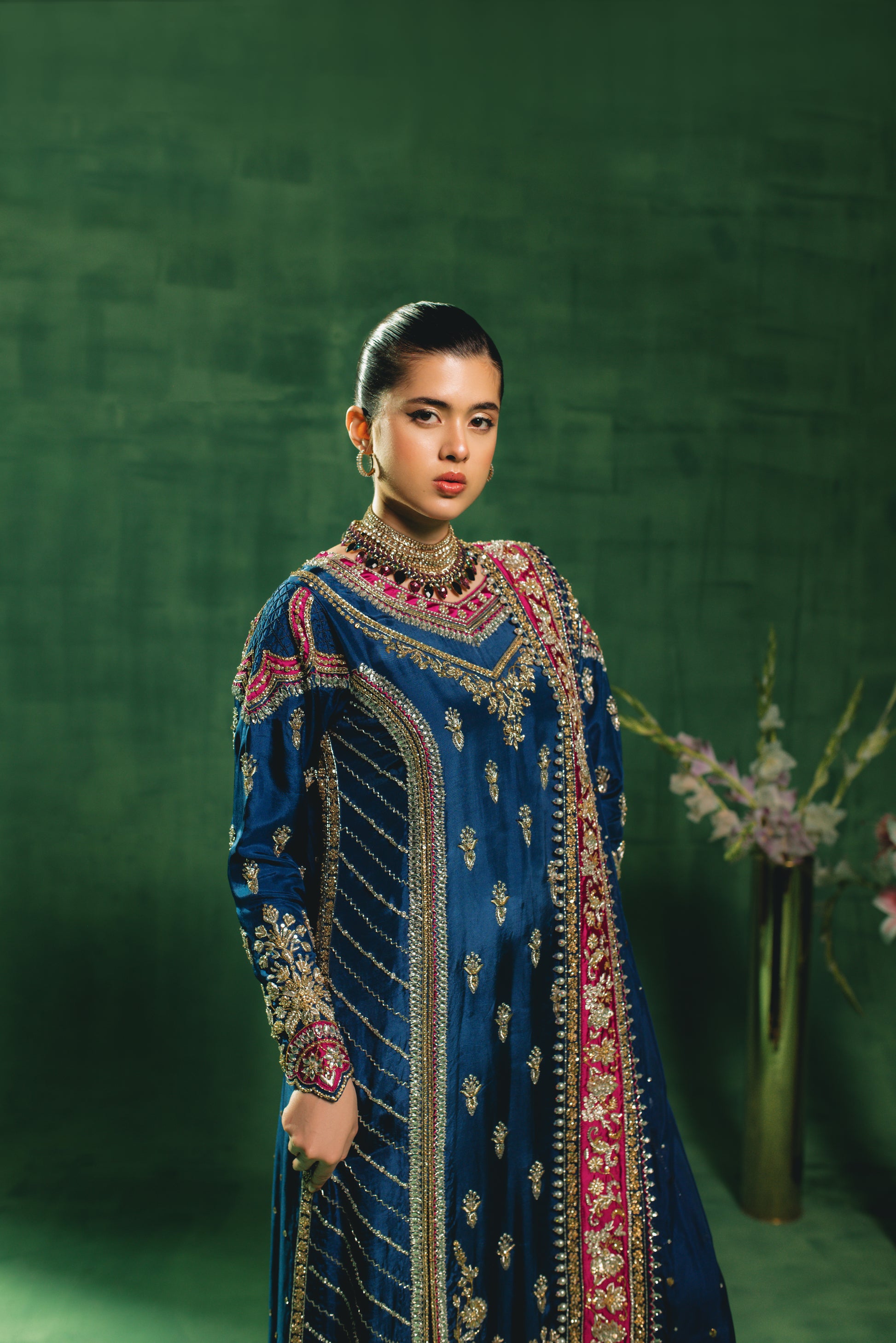 "Indulge in the regal allure of our Sapphire Blue ensemble, a masterpiece of traditional craftsmanship. The shirt and voluminous sharrara are tailored from premium Sheesha Silk and heavily embellished with intricate hand-adda work, featuring a rich interplay of dabka, naqshi, stones, pearls, and sequins. This opulent look is paired with a Medium Silk dupatta, delicately accented with an all-over mukesh spray (chan) and finished with exquisite tassel detailing.